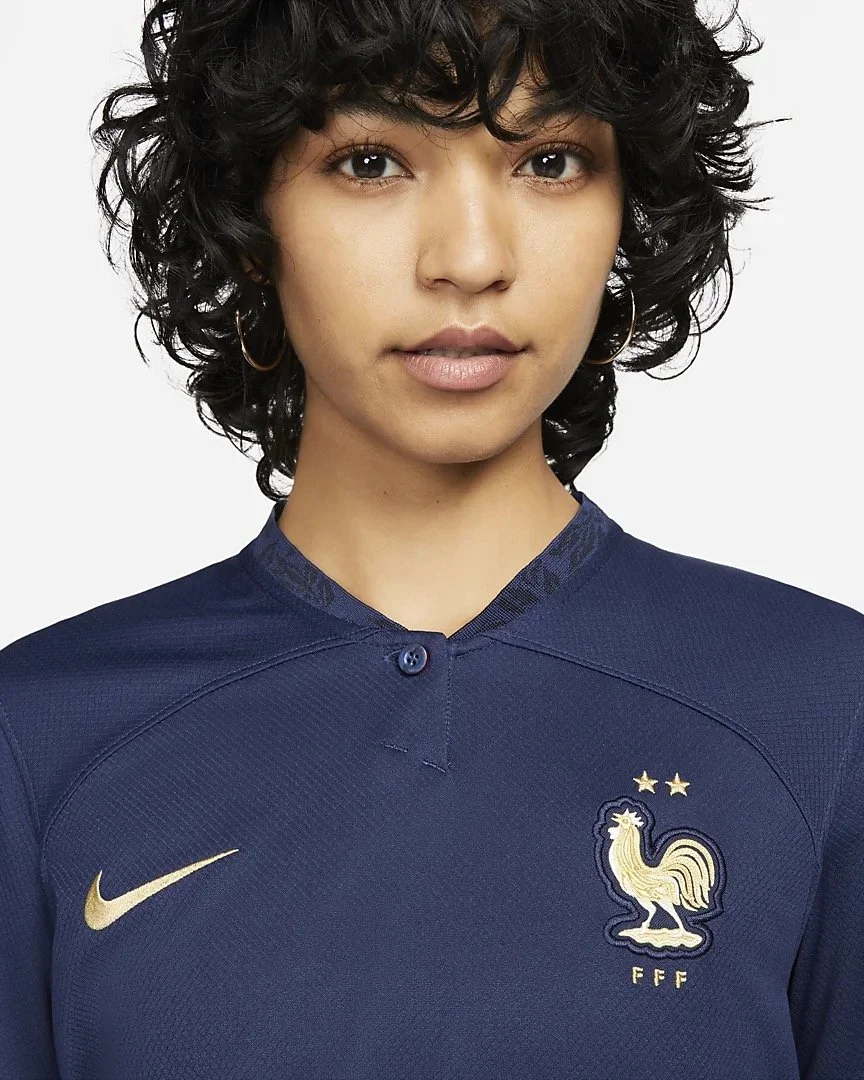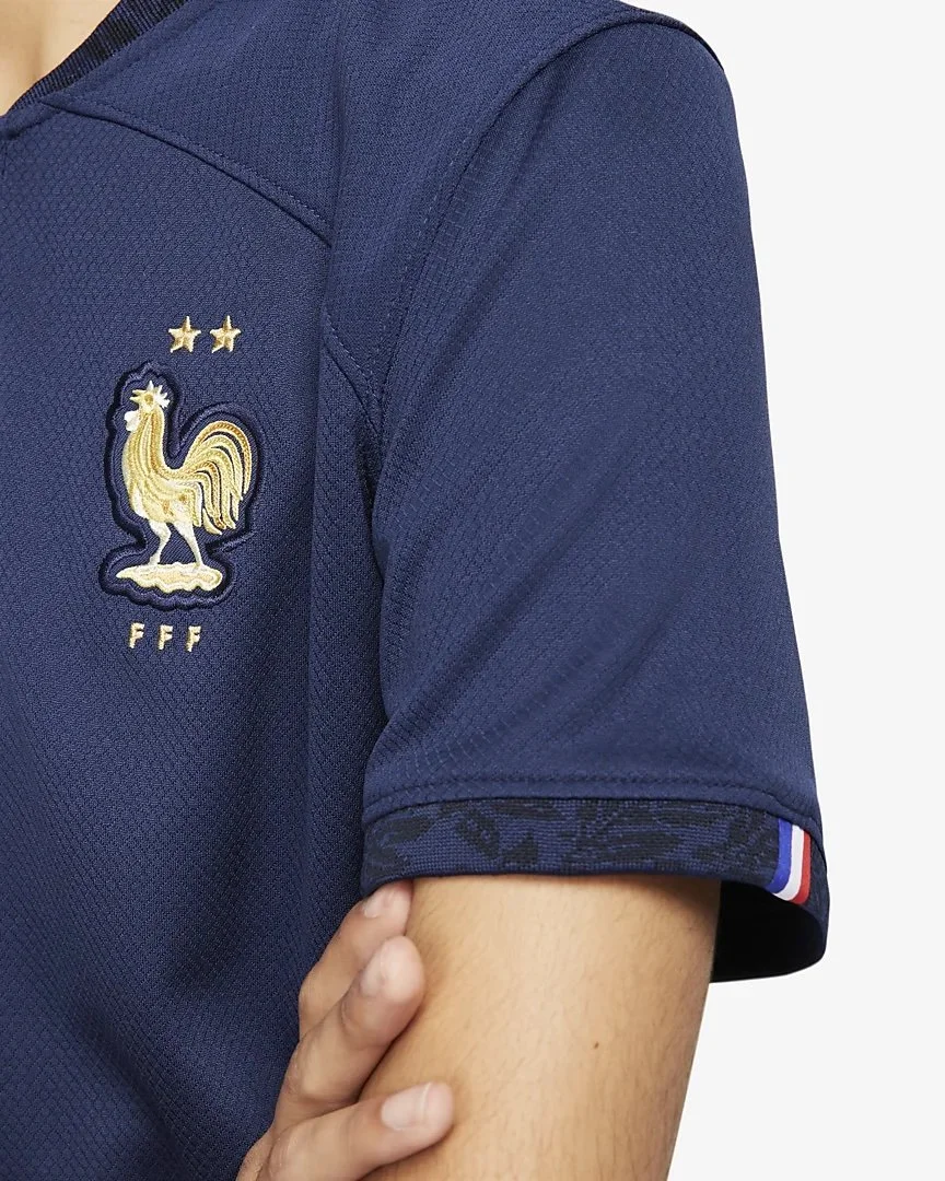 The home kit carries a gold crest and branding honoring France’s past victories in the world cup. A tonal oak leaf was incorporated into the rib of the jersey representing the Chene Chapelle or “royal oak”. Often used to portray family, royalty, and prosperity.