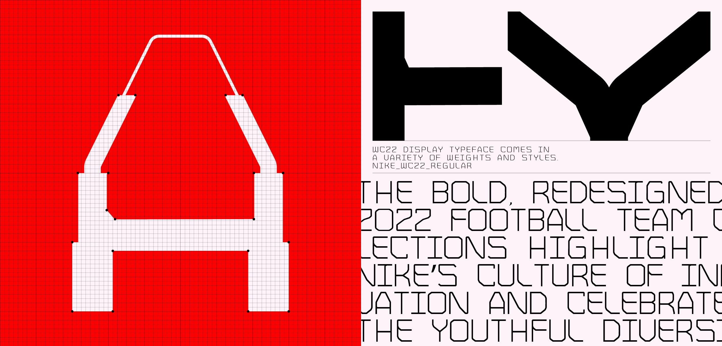 The most technically advanced world cup to date deserved a technical typeface. With data-informed design on athletes bodies, I wanted to develop a typeface that would reflect tech and the future of football. The result is Nike WC22. A display typeface that incorporates elements from Nike’s 2022 Match adv Knit jersey. Used for internal branding and adorning the backs of players as the branded name + number typeface on pitch.
